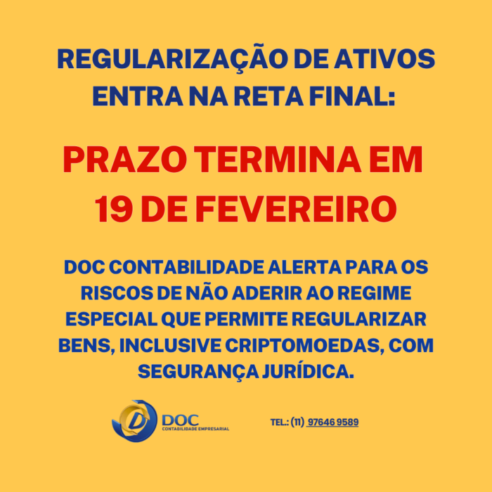Regularização de ativos entra na reta final: prazo termina em 19 de fevereiro
